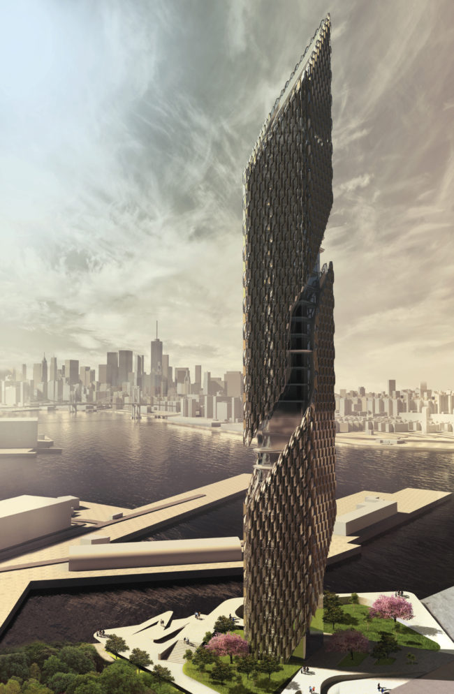 Adopting the The Metals in Construction magazine 2018 Design Challenge as an opportunity to conduct design research on integrating textile based tectonics with the practical concerns of a building envelope, the ARCH 507 Design 9 studio challenged the students to generate ideas for high-performance facades. The competition’s focus was on creating new types of building envelopes that can enhance workplace health and well-being through adaptive and responsive facades incorporating air and water quality, thermal control, visual connection to the external environment, and aesthetics. The facade was assigned for a hypothetical 30-story office tower located on a waterfront site in the heart of Brooklyn’s Technology Hub.