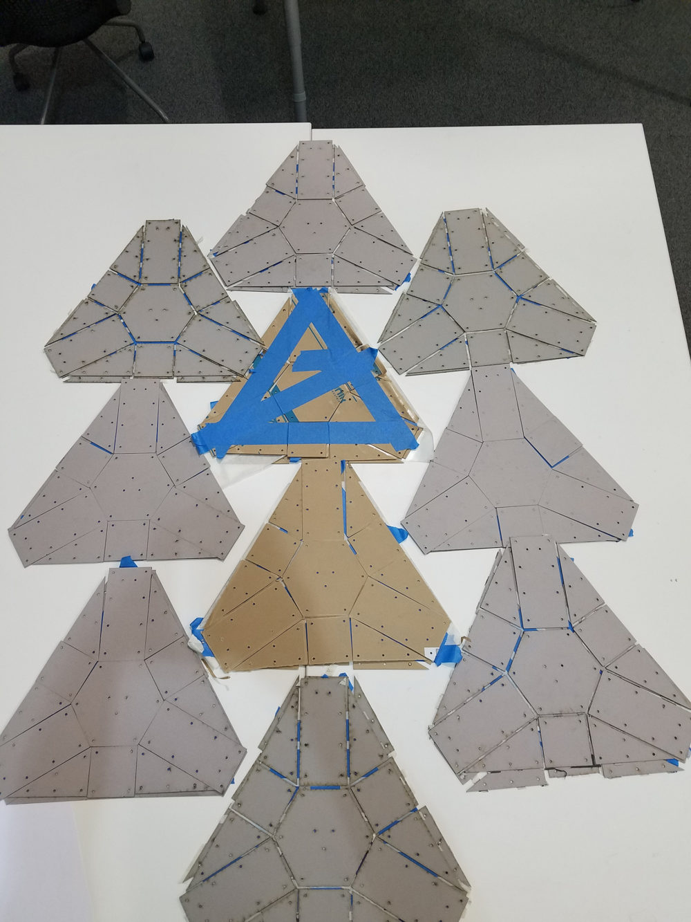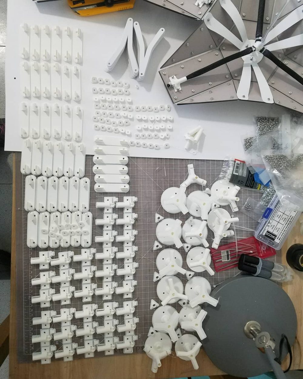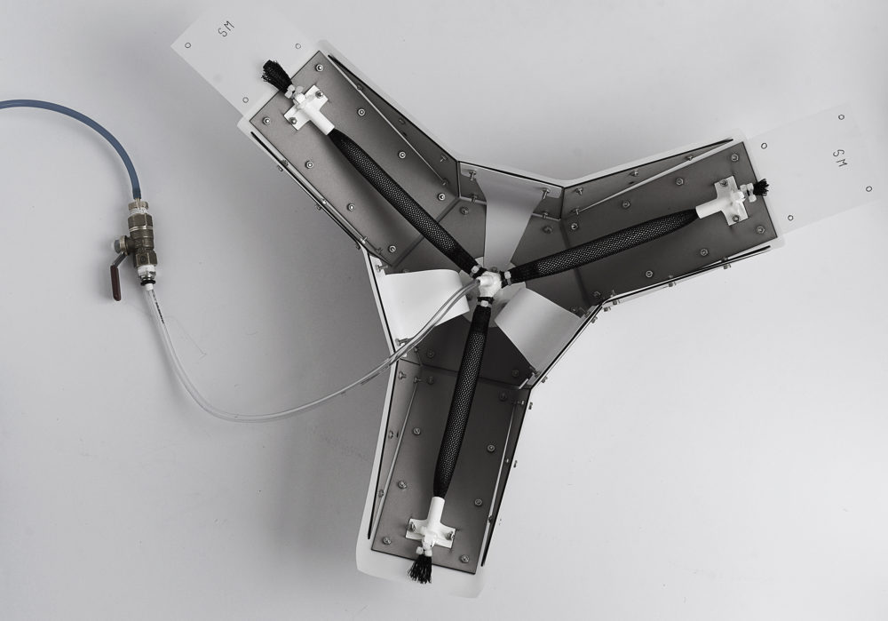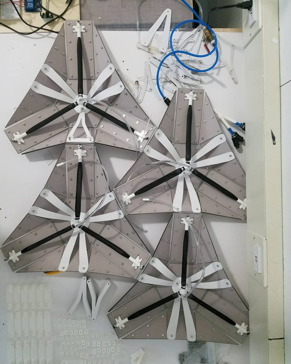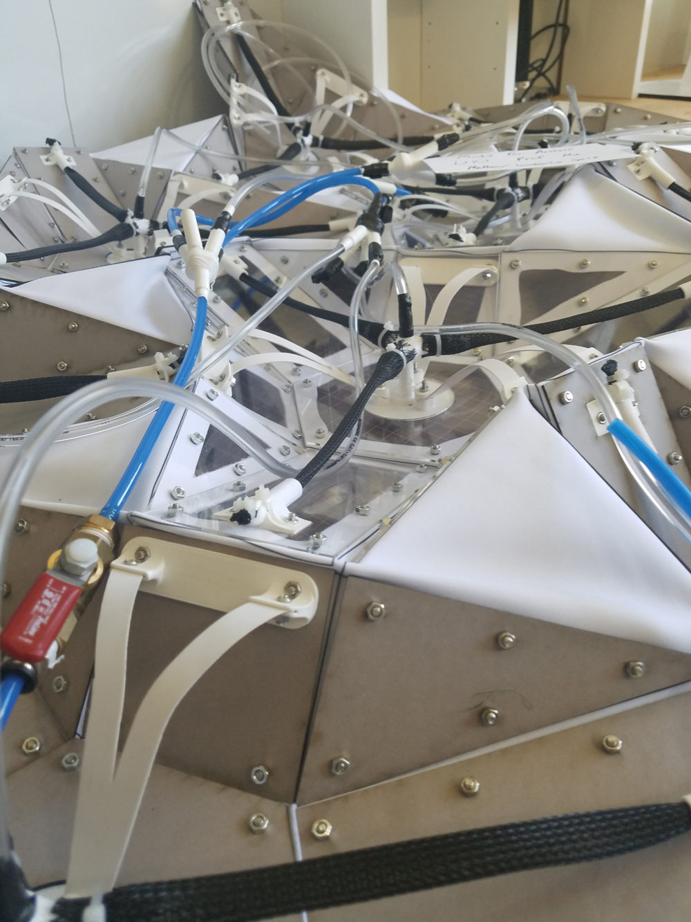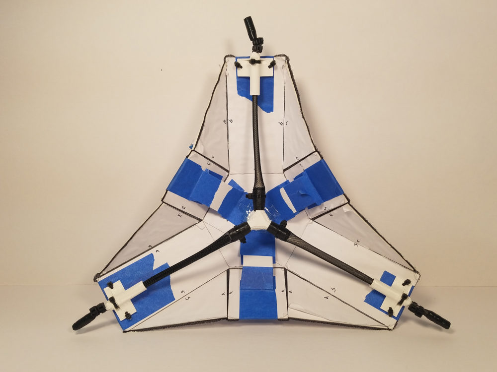 Assembly: The final prototype assembly required a plethora of pieces per each module. Each module required 26 solid panels(13 per side), 9 custom 3D printed pieces (1 air splitter, 1 fastening plate, 3 end connectors, 3 plastic hinge brackets, and a small series of angled standoffs that prop the plastic arms in just the right angle), 3 Pneumatic Air muscles, and teflon tape to ensure proper air seals.  The total assembly per module is assembled between a layer of fabric, printed upon using dye sublimation processes.
