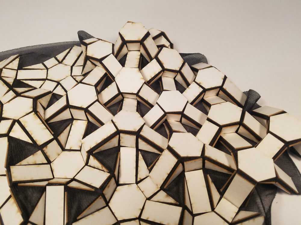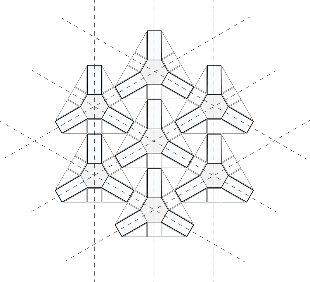 Axial relationship: The final working prototypes show the axial relationships held between each module, where a set of 3 parallel lines show its potential movement. These 3 axes dictate the directions of rigidity within the prototype, and perpendicular intersections to these axes between each module show where all hinging actions occur. In order to maintain this relationship, as well as the proportional spaces between each panel, slight offsets were added to the final prototypes that keep certain panels spaced from each other. This ensures that the folds are kept towards specified directions up on activation.