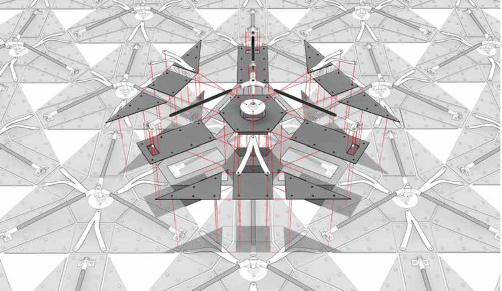 After several iterations of the prototype at a sketch model quality, the final prototype was realized. At the same time, the project took on  multiple  applications,  as  a dynamic system such as this held an impressive range of actuation. The finalized material system could potentially take on the assumption of any building surface. As a wall and opening system, it could potentially open and close based upon  movement  of  people, with ranges of openness and closedness, as well as the ability to direct the movement of people in and out of a space. It can also serve as an adaptive canopy system suspended on a set of rolling columns, that move as the material system moves. More applications would come to follow, as the material systems qualities may yet inform new utility.