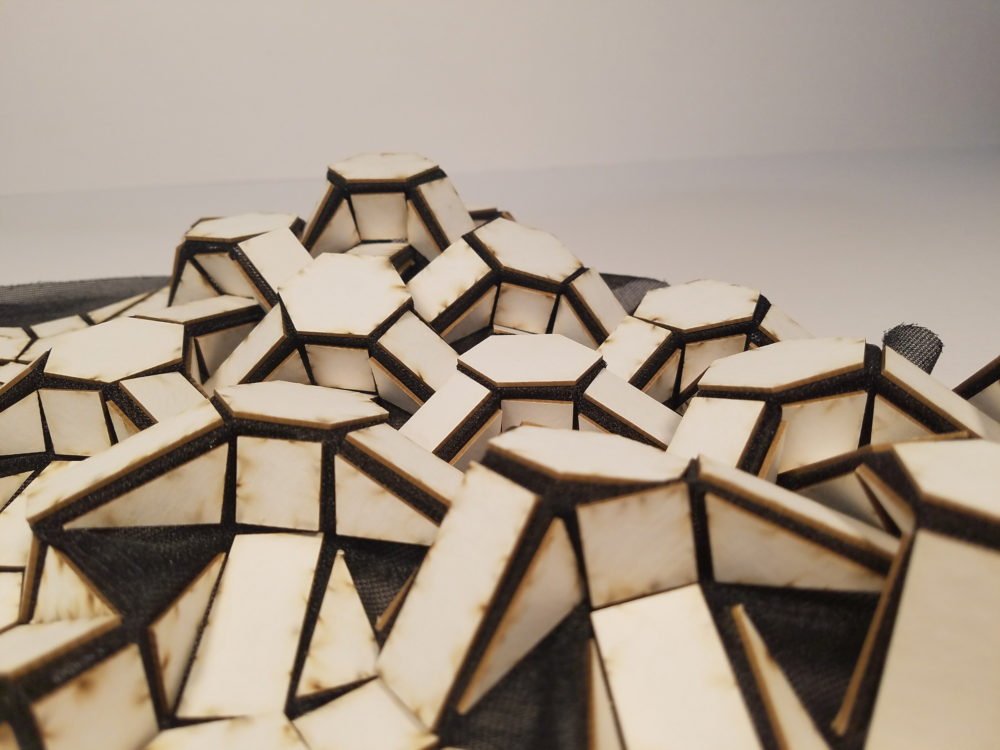 Now that the pneumatic muscle system was able to power the individual module’s transformative properties, improvement could commence. Eventually, as more modules are added, a compressor became necessary to power the activation, due to its increased rate of pumping air as well as its capability of air pressure in psi. This opened up multiple avenues for the module to fail, as air seals were consistently broken, hinging systems wore away too quickly, and overall actuation showed little variance in transformative qualities. With studies in both the digital and the physical modeling scales occurring simultaneously, the project progressed slowly until a major breakthrough was discovered. Continuous ambiguity of the prototype finally led to insight towards the application and implementation of the kinetic material system.