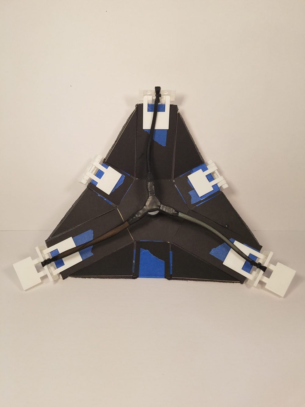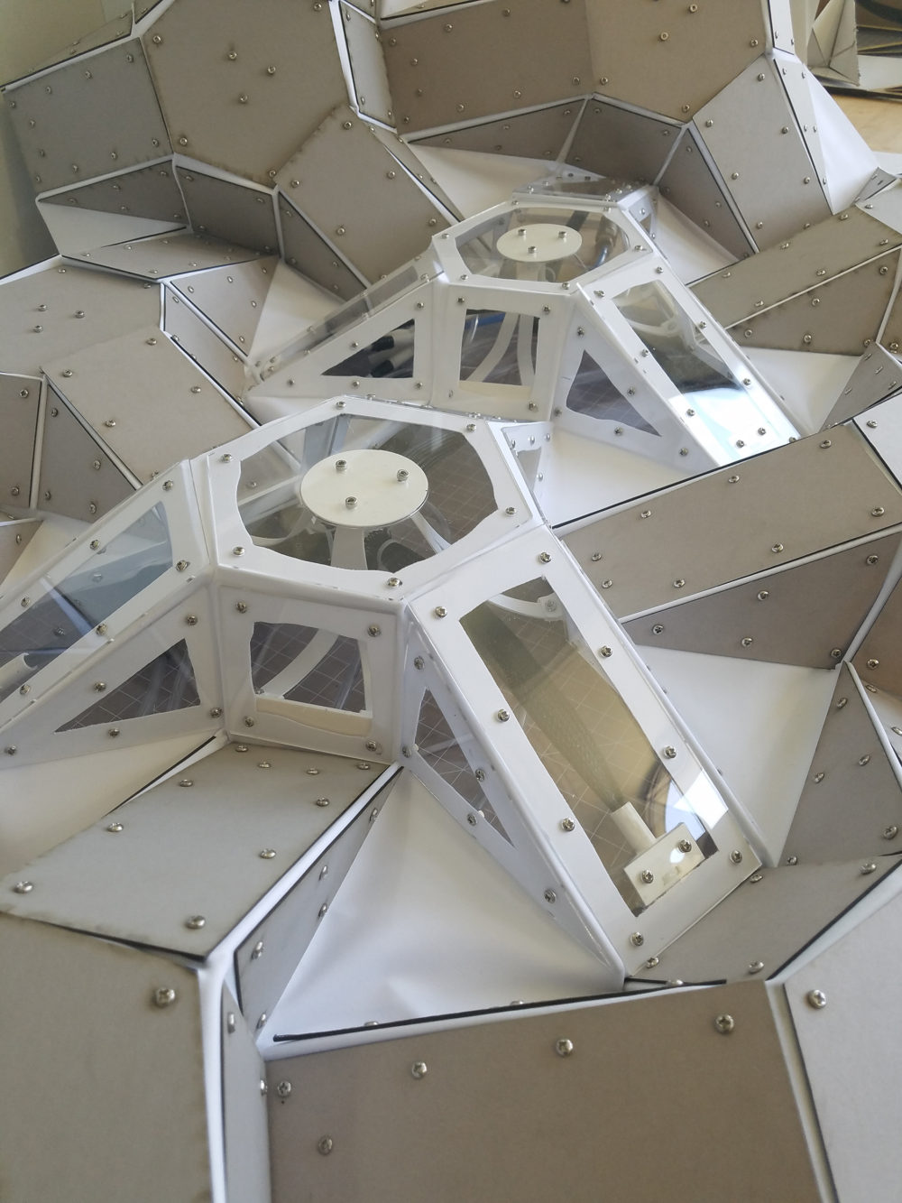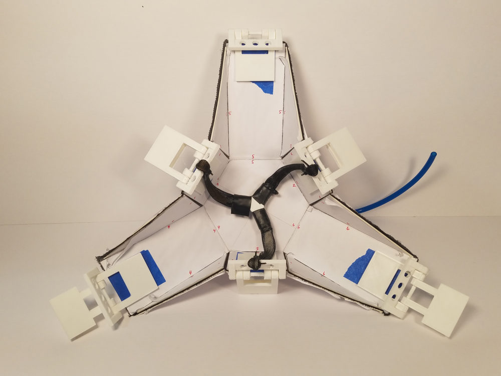 The Origami Module: As a developed system, Each origami module consists of a large number of parts, all that contribute to its proper movement. Here, an extensive set of 3d printed iterative pieces were used to explore movement and actuation. Starting from simple clips that allowed the module’s legs (long edges) to be wired together, and finalizing upon different pneumatic hoses, connectors, hinges, and arms that all moved fluidly, the module’s actuation process was highly iterative.